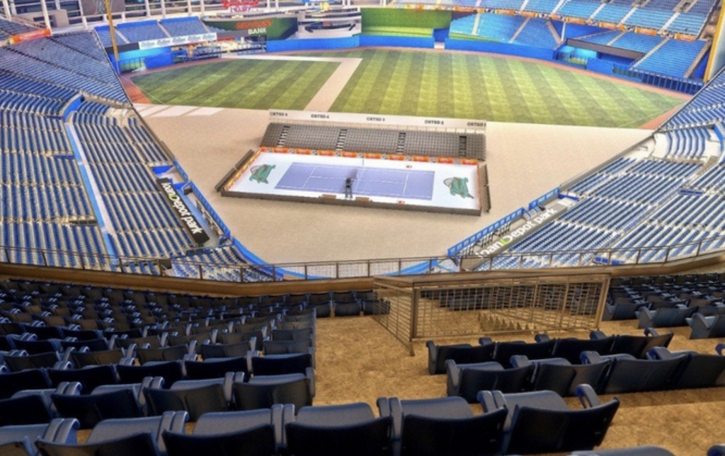 O duelo vai realizar-se no LoanDepot Park, estádio de basebol dos Miami Marlins, e, perante a imensidão do recinto, foram instaladas bancadas portáteis o mais perto possível da zona de batimento. O resultado é uma imagem raramente vista num campo de basebol, com o court posicionado num cenário totalmente invulgar.